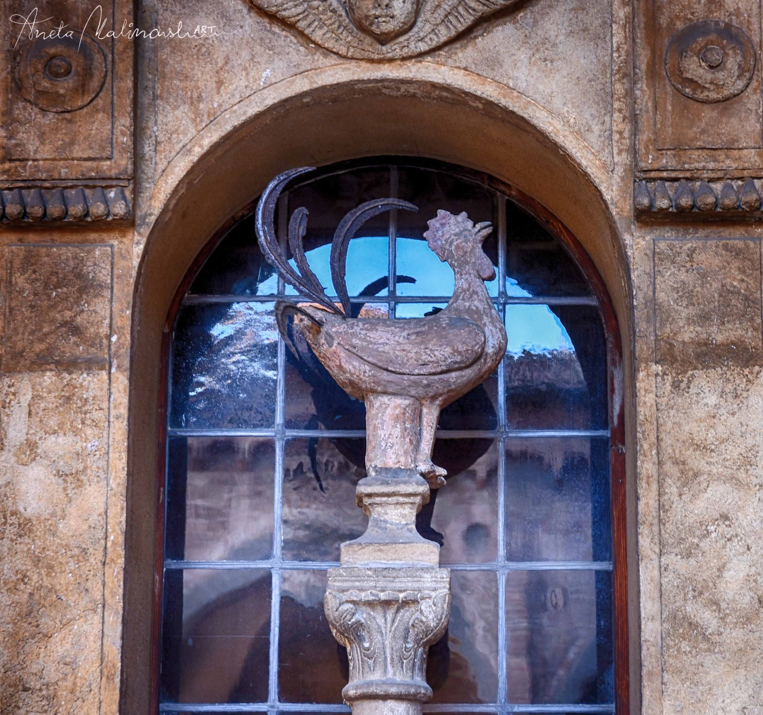 Sotto il porticato su una colonna al centro di una finestra troviamo gallo di pietra risalente al XIV secolo, chiamato “Gallo di San Pietro” per ricordare l’episodio evangelico del rinnegamento di Gesù.