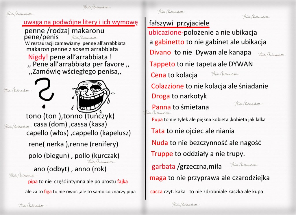 Jak w każdym innym języku także i we Włoskim znajdziemy słowa pułapki Często polskie słowa używane we Włoszech mają identyczną lub podobną wymowę lecz odmienne znaczenie ,nie dziwcie się ,że właśnie tu najpopularniejszym słowem będzie curva czyt.kurwa, tu możecie przeklinać do bólu nikogo to nie obrazi i nikt wam nie zwróci uwagi .Kurwa usłyszycie zwłaszcza jadąc samochodem .Nie zapomnę dawno temu siedząc obok kierowcy ,kierowca wciąż narzekał :