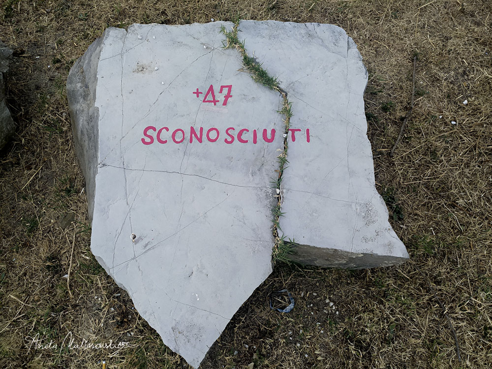 53 sassi, su ognuno dei quali è inciso il nome di un trucidato, più un cinquantaquattresimo per ricordare i quarantasette caduti ignoti……
