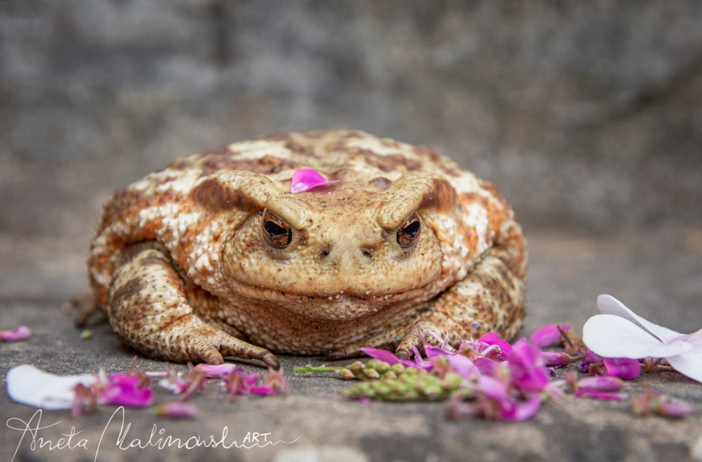 Inoltre qui crescono varie piante in cui un bel albero di magnolia , lavanda che ha cresciuto spontaneamente ,altri fiori, le piante rampicanti ed piante spotnanee .Un microambiente dove stanno bene non solo le api ma anche un ospite molto maestoso -rospo comune (bufo, bufo). L’ho trovato immobile su un gradino delle scale che riposava al ombra .