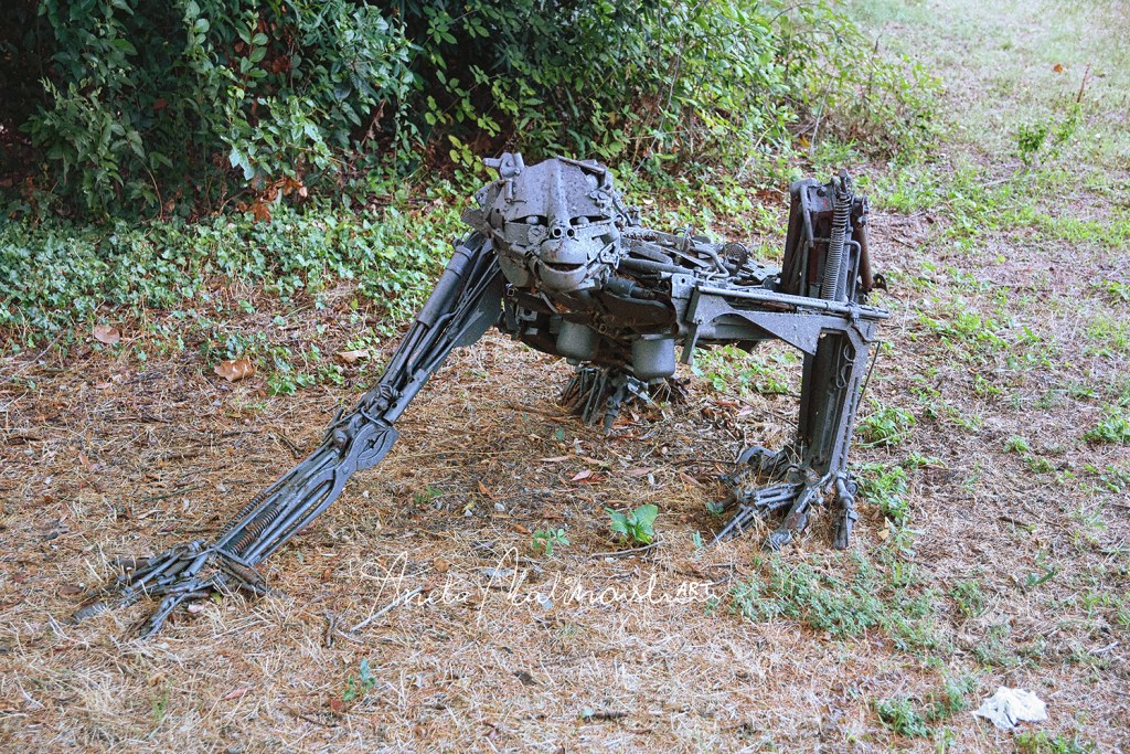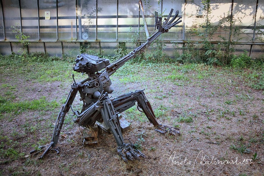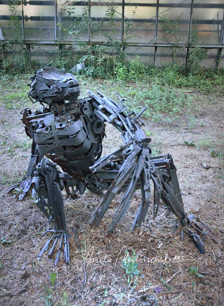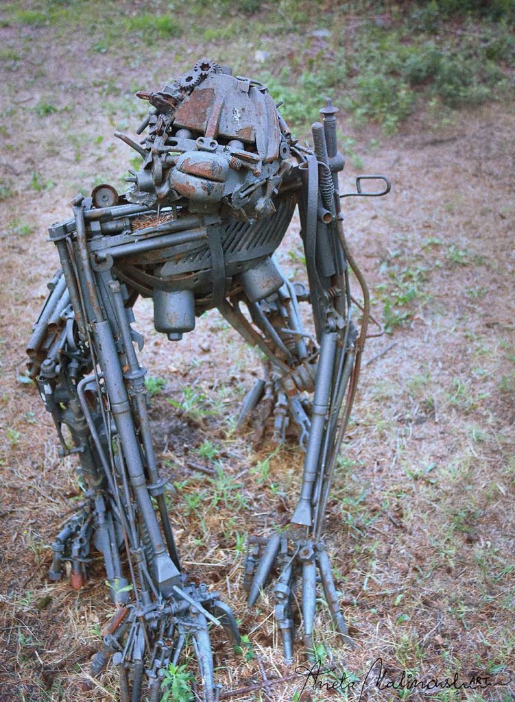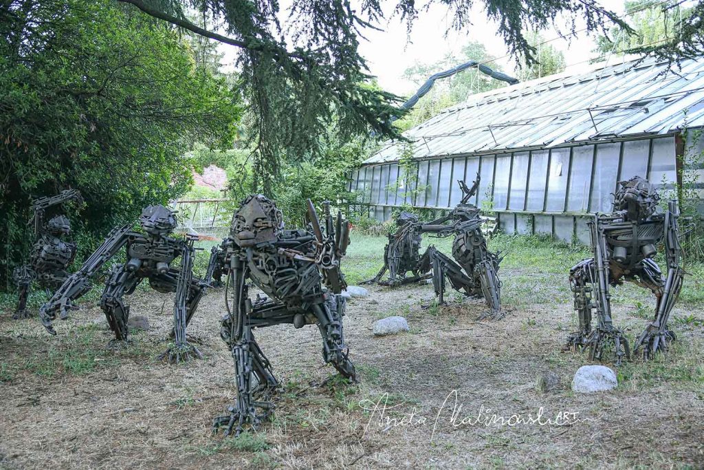 Opera è di scultore, designer e scenografo teatrale Simone Bellotti, nato a Bologna nel 1967, dove vive e lavora. Le sculture esposte rappresentano gli scimpanzé che stanno per trasformarsi in umani, rinascita dell’uomo dal degrado e disastro ambientale a partire dalla spazzatura con cui ha avvelenato la terra.Tutte le sue opere sono state fatte con materiali di recupero (ferro riciclato, sedie rotte, vecchie porte, travi, mobili vecchi ,vari pezzi di elettrodomestici ecc. .) Riciclaggio artistico di oggetti abbandonati che vengono utilizzati con uova nuova funzione e danno la vita alla creatività.