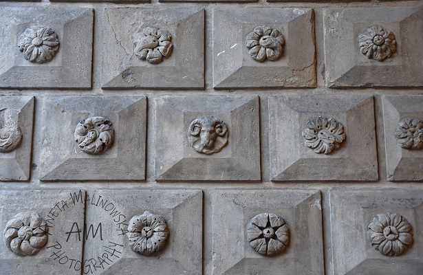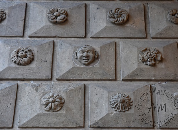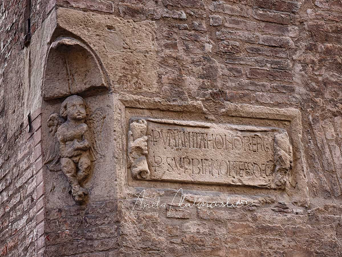 The Palazzo del Podestà preserves thousands of ornamental tiles with relief decorations, known locally as “formelle,” which are rectangular and square in shape and feature floral motifs and, less frequently, human faces, animal heads, and coats of arms. Legend has it that there are two identical tiles with the same ornament, but so far no one has been able to prove it. There is also a relief depicting King Enzo’s attempt to escape from Palazzo Re Enzo, where he was held prisoner. After numerous and controversial calculations, a 1927 article by Giulio Ricci established the definitive number of decorated tiles, totaling 7,476.