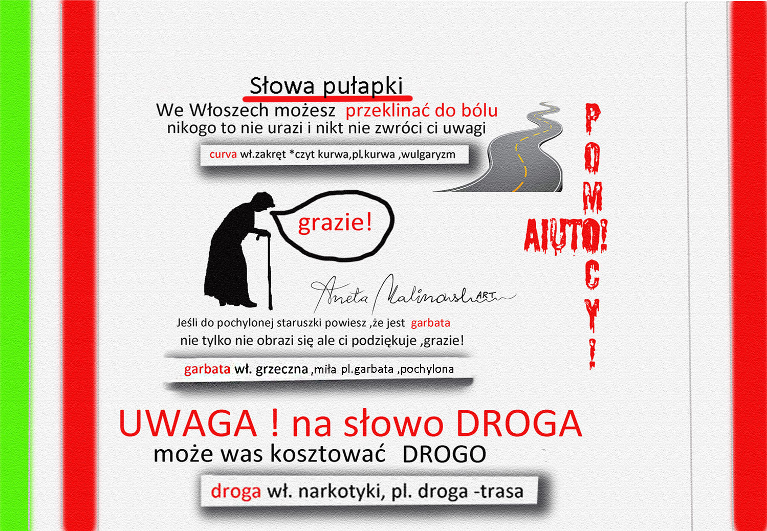 DROGA ,GARBATA KURWA hmmmm. po polsku brzmi to naprawdę nieciekawie ….odkryjmy te słowa w znaczeniu włoskim . Jak w każdym innym języku także i we Włoskim znajdziemy słowa pułapki Często polskie słowa używane we Włoszech mają identyczną lub podobną wymowę lecz odmienne znaczenie ,nie dziwcie się ,że właśnie tu najpopularniejszym słowem będzie curva czyt.kurwa, tuContinua a leggere “Polsko-włoskie pułapki językowe”