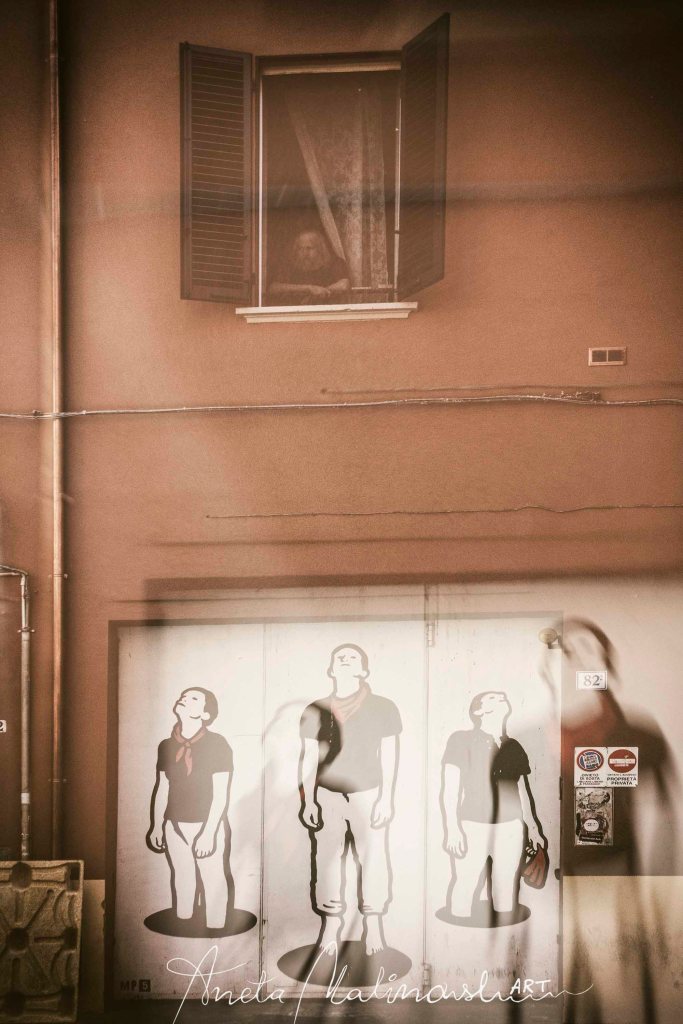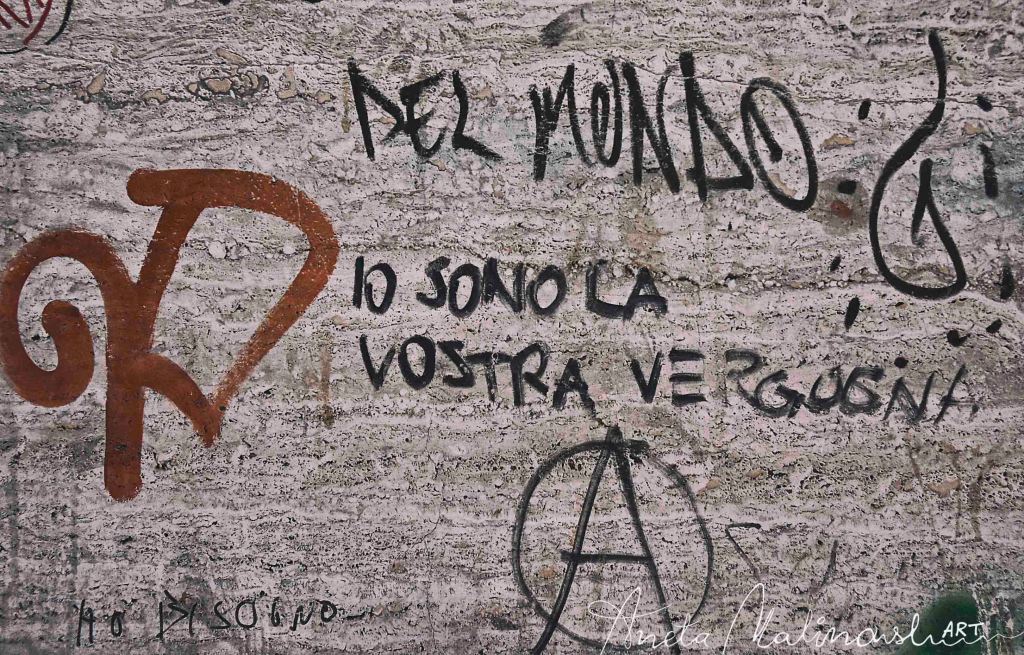 «Progetto fotografico racconta una risposta verso chi scrive e dipinge sui muri di Bologna. I muri hanno delle orecchie, la voce e gli occhi, ci osservano, ascoltano e rispondono. I Muri di Bologna sono stanchi e preoccupati. Ragioniamo insieme. I vostri pensieri feriscono l’intera città, lasciateli liberi nell’aria, gridate la vostra poesia, frustrazione, amore e rabbia senza sporcare i muri della nostra casa. Quanto può essere banale avere la ragione usando la mente. Questa è una Bologna che non vorrei, orfana fra la gente che non vuole prendersi cura di lei, che non ha chi la difende. Io sono la vostra vergogna….».